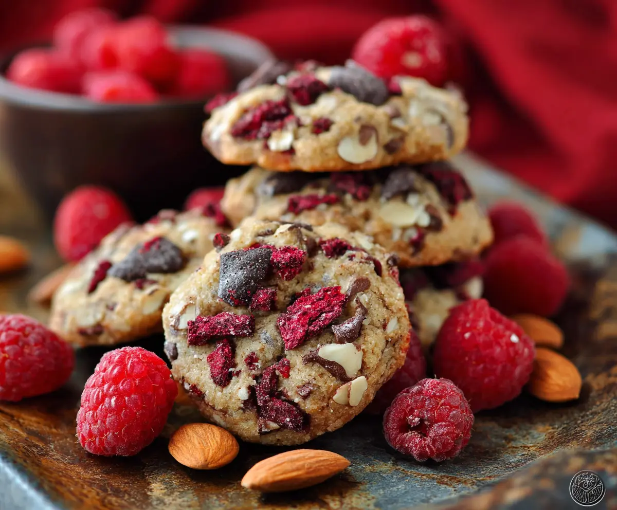 Delicious raspberry almond cookies with colorful freeze-dried berries for a tasty treat.