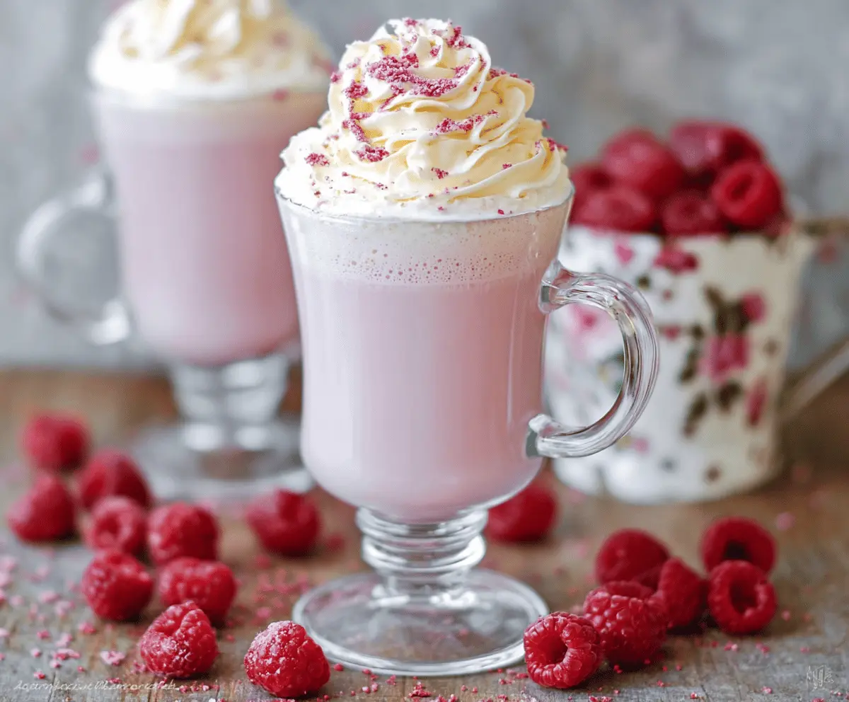 Don’t forget the fun part! Top each mug with a generous swirl of whipped cream. For an extra touch of festivity, garnish with a fresh raspberry on top and sprinkle some pink colored sugar or raspberry-flavored sprinkles for a pop of color.