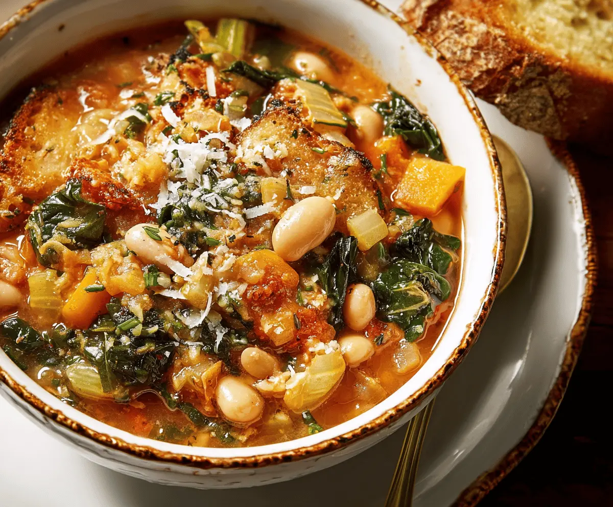 A bowl of hearty Ribollita soup featuring tuscan bread, kale, beans, and vegetables, served in a rustic bowl with fresh herbs.