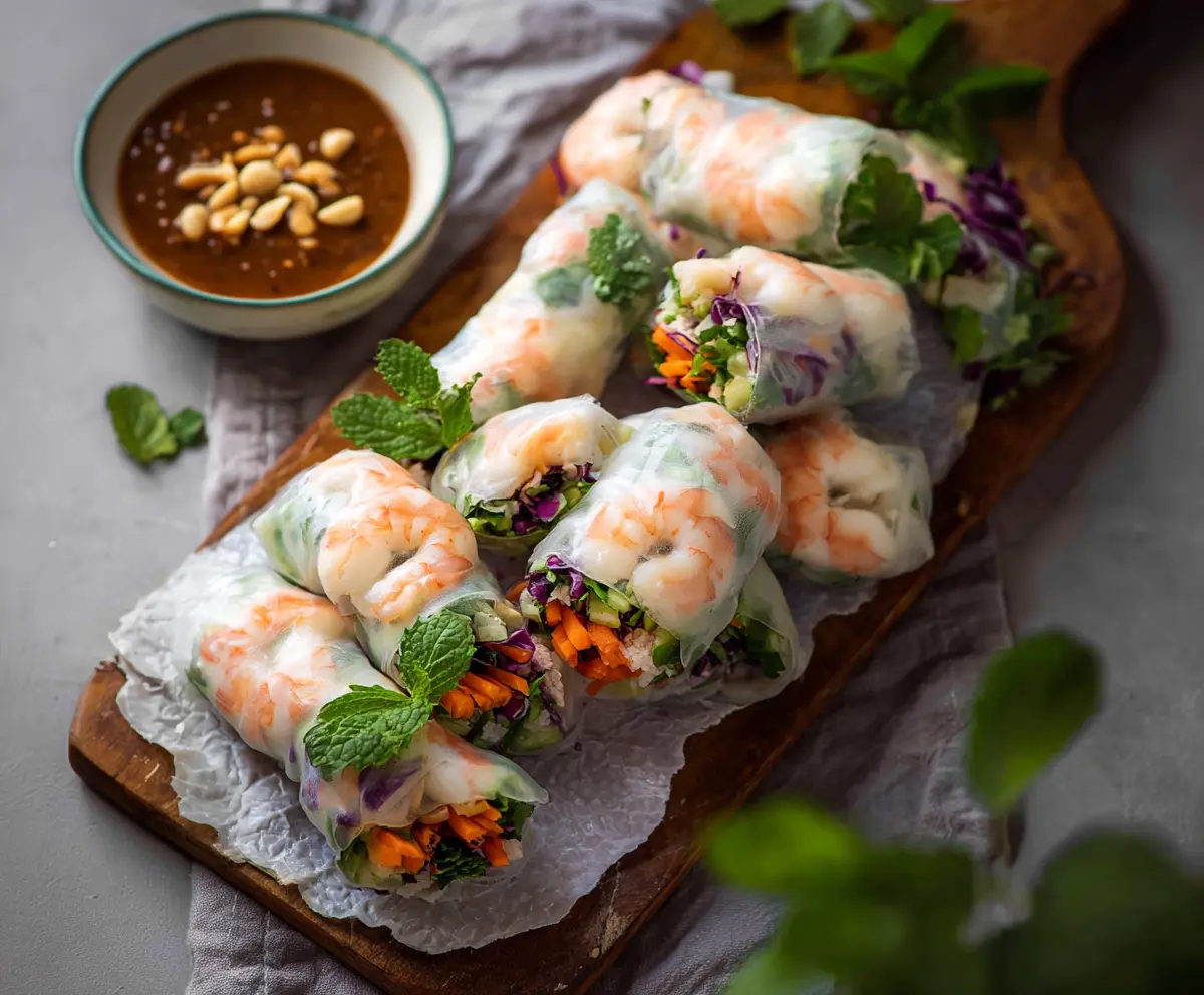 Fresh shrimp rice paper rolls filled with crisp vegetables and herbs, served with dipping sauce.