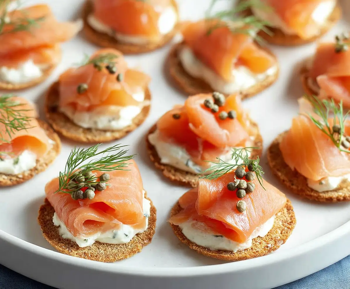 These smoked salmon canapés are fun little bites bursting with flavor! They’re easy to make with crispy bread, creamy cheese, and delicious smoked salmon on top.