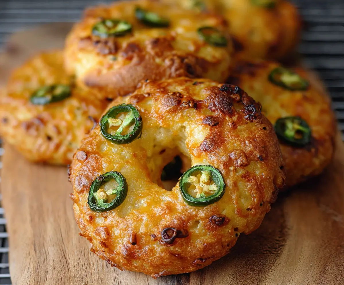 These spicy jalapeño cheddar bagels are a fun twist on your regular breakfast treat! With bits of zesty jalapeños and gooey cheese, they pack a punch in every bite.