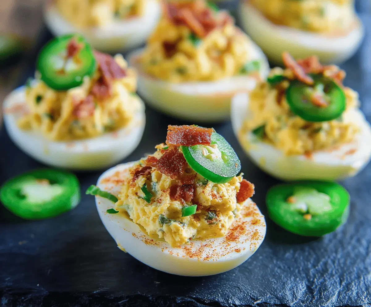 Top each deviled egg with a slice of fresh jalapeño and a sprinkle of crumbled bacon. For an extra touch, you can add a dash of smoked paprika and some fresh parsley or cilantro on top. Chill in the fridge for at least 30 minutes before serving to let all those delicious flavors meld together.