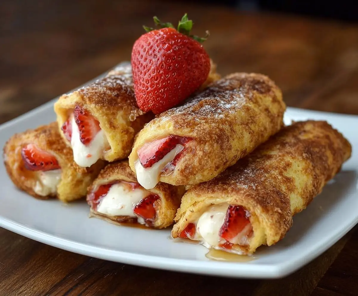 Once cooked, remove the roll ups from the skillet and place them on a paper towel-lined plate to drain any excess oil. Arrange the roll ups on a serving plate, dust them with additional powdered sugar, and drizzle with strawberry syrup or jam if you like.