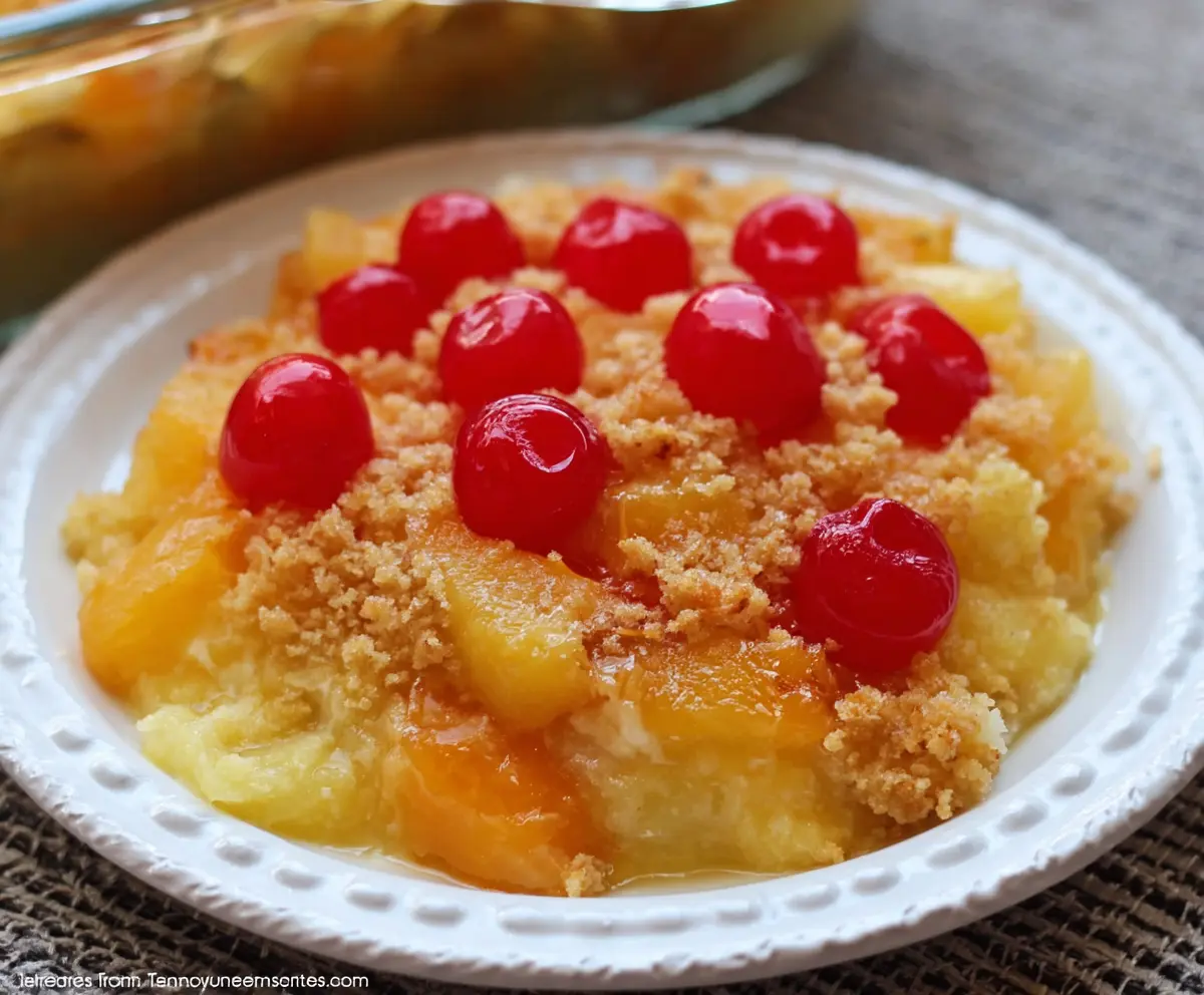 This Sweet And Sour Pineapple Casserole is a comforting side dish that strikes a perfect balance between tangy pineapple, creamy goodness, and a deliciously crispy topping, all topped off with bright cherries. Enjoy every bite!