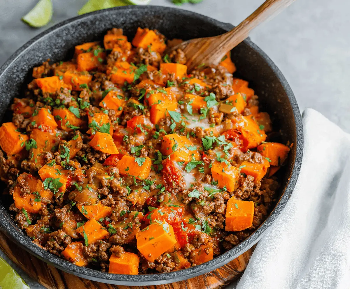 Delicious sweet potato and ground beef skillet served in a vibrant, rustic dish.