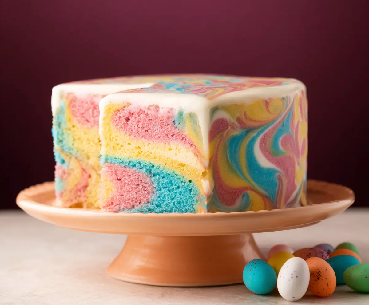 Once decorated, slice your colorful Swirled Easter Cake and serve it to your delighted friends and family. Enjoy the lovely flavors and festive spirit!
