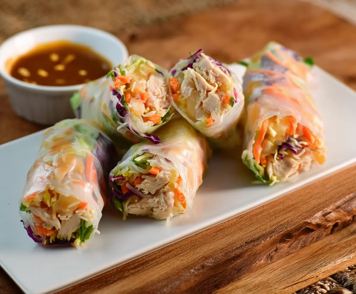 This dish will take about 20 minutes to prepare. You’ll spend roughly 10-15 minutes cooking the chicken and preparing the fillings, and then about 5 minutes rolling the rice paper rolls. It’s a quick and fun meal that’s sure to impress!