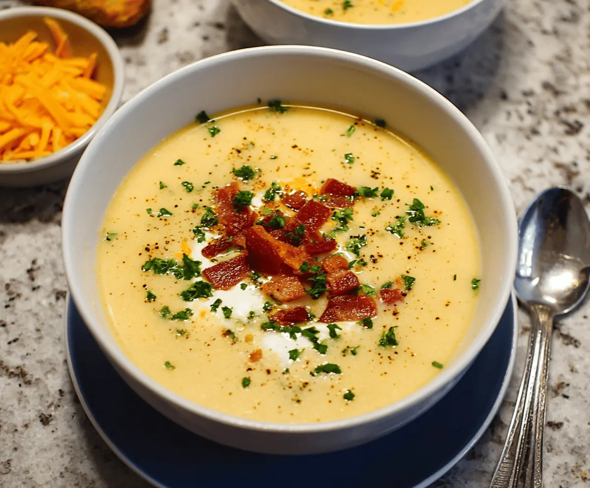 Dish out the warm soup into bowls, and let’s make it pretty! Top with crumbled bacon, chopped green onions or chives, and a little dollop of sour cream or crème fraîche. If you love cheese, sprinkle some shredded cheddar on top for extra goodness.